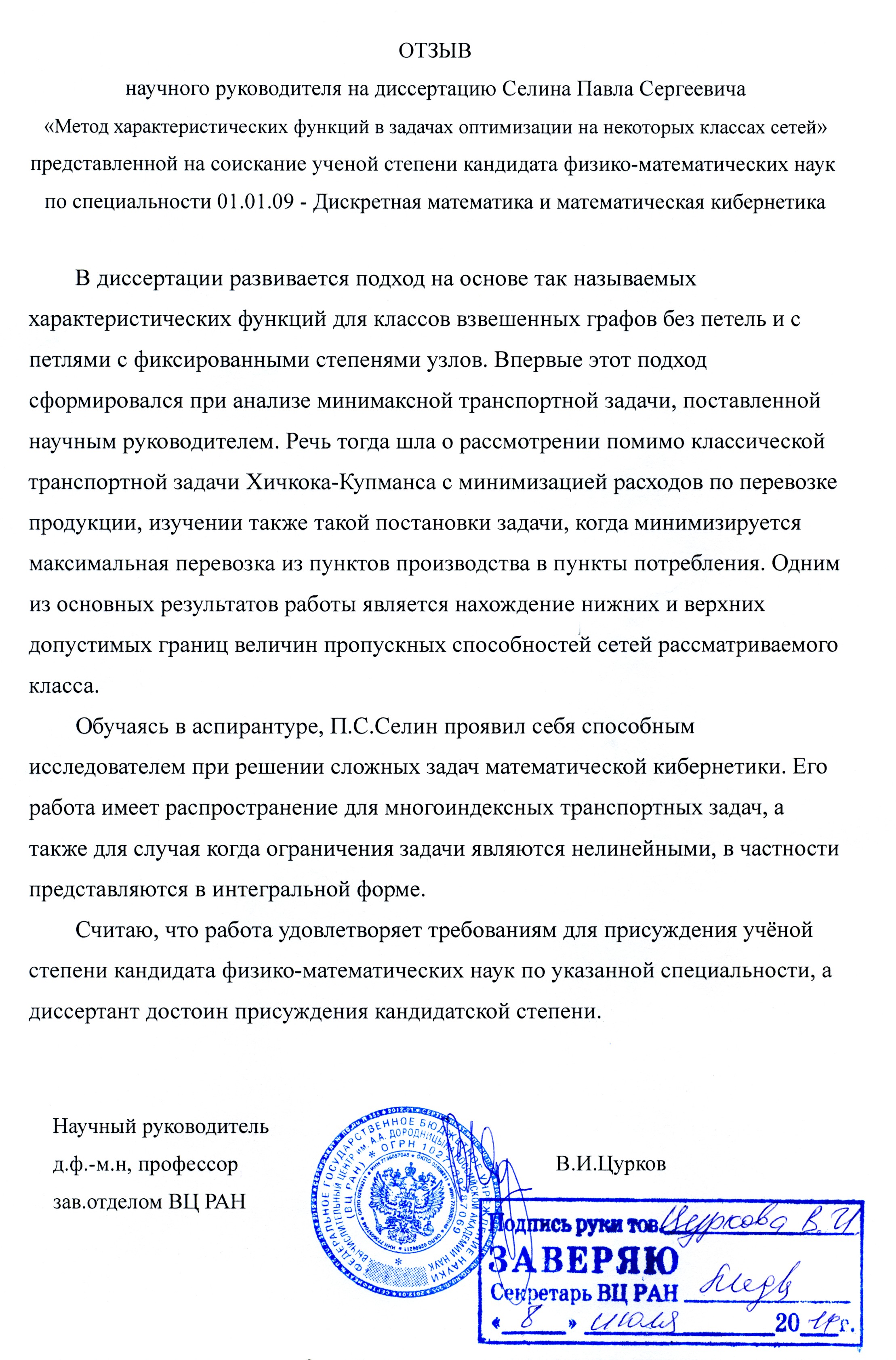 Автореферат (747 Kb): http://www.ccas.ru/avtorefe/0014a.pdf30 октября 2014 г. в 16 часов 00 минут состоится защита диссертации на соискание ученой степени кандидата физико-математических наук Селина Павла Сергеевича «Метод характеристических функций в задачах оптимизации на некоторых классах сетей» по специальности 01.01.09 — «Дискретная математика и математическая кибернетика» на Диссертационном совете Д 002.017.02 при Федеральном государственном бюджетном учреждении науки Вычислительный центр им. А. А. Дородницына Российской академии наук по адресу: 119333, Москва, улица Вавилова, дом 40, конференц-зал.
