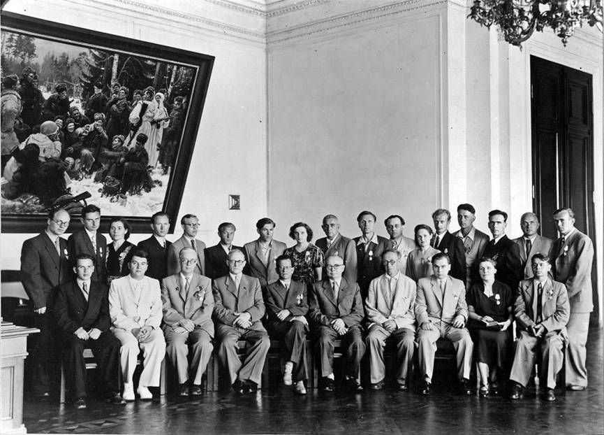 награждения за работу по созданию БЭСМ АН СССР в Кремле ( Сидят (слева-направо): Ю.А. Крицкий, В.В. Бардиж, Ю.Д. Панов, А.Ф. Горкин, С.И. Лебедев, К.М. Озолинь, М.А. Лаврентьев, И.С. Мухин, И.Д. Визун (Горелова), Д.Т. Стукалов. Стоят (слева-направо): В.М. Курочкин, А.А. Абрамов, А.И. Срагович, П.И. Козулин, Н.Н. Фориш, В.В. Похлёбкин, Н.В. Абаев, Л.В. Сидорова (Гаврилина), Ю.Р. Валашек, А.А. Москвин, Н.П. Зубрилин, А.Г. Лаут, Г.Т. Артамонов, В.С. Бурцев, Ю.И. Визун, В.А. Зимин, В.С. Чунаев. Также Владимир Михайлович был отмечен * юбилейной медалью «В