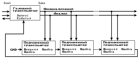 Сигналы Инициализация, Анализ и Ошибка называются системными управляющими сигналами (System services). Объединительные вычислительные платы фирмы INMOS имеют общую схему распространения этих сигналов по сети транспьютеров. Каждая плата имеет три порта коммутации системных сигналов: От_Предыдущей (Up), К_Следующей (Down) и Собственные(Subsystem). На порт От_Предыдущей подаются системные сигналы от внешнего источника (внешние системные сигналы). Эти сигналы можно подать на все ТРАМы платы и передать на следующие платы. Это позволяет контролировать всю сеть сигналами от одного источника. Порт Собственные вычислительной платы соединен с внутренней шиной корневого транспьютера и контролируется регистрами, размещенными в зарезервированной области внутренней памяти. Он позволяет создать независимо управляемую подсеть из транспьютеров этой платы и подключаемых к ней других плат. Сигналы этого порта называются внутренними системными сигналами. Порт К_Следующей распространяет сигналы порта От_Предыдущей или порта Собственные на платы, подсоединяемые к рассматриваемой вычислительной плате.
